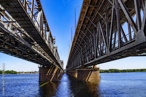 © ioanna_alexa, Obraz premium View of the Dnieper river under the Amur bridge in Dnipro (Ukraine). Engineering-architecture geometric background with straight lines and perspective. Water surface with copy space