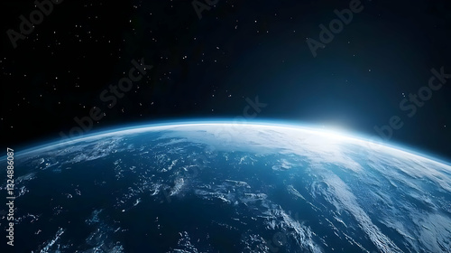 © Edo, Obraz premium View of the Earth from Space with Blue Illuminated Surface and Glowing Horizon Against a Black Background with Bright Stars