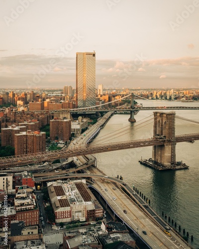 Fototapeta premium View of the East River with Manhattan and Brooklyn Bridges at sunset, from...