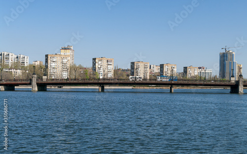 Naklejka premium View of the embankment of the Kalmius river and bridge over it in Donetsk....