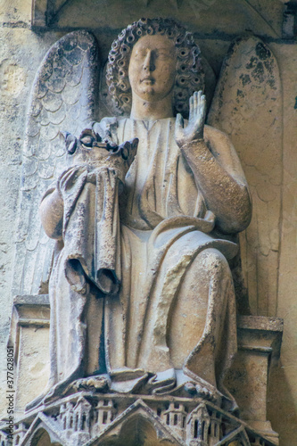 © ahinoam, Fototapeta premium View of the exterior facade of the Roman Catholic Notre Dame de Reims Cathedral, a historical monument in the Grand Est region of France and one of the oldest in Europe