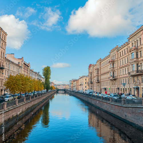 © westermak15, Obraz premium view of the Fontanka canal with beautiful houses on the shore against the blue sky