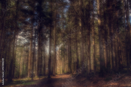 © sandradombrovsky, Naklejka premium View of the forest with mystical light.