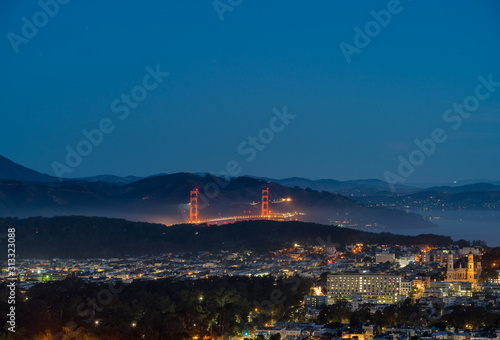 © porqueno, Obraz premium View of the Golden Gate Brdige At Night With Fog Over the Bay