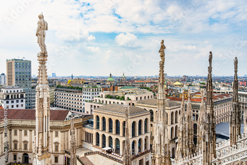 © Cristi, Obraz premium View of the gothic ornate spires and statues adorning the rooftop of the Milan Cathedral (Duomo di Milano) in Italy.