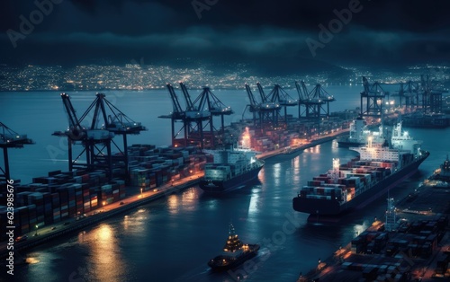 Fototapeta premium View of the harbor with container ships, Logistics and transportation of cargo ship, logistic import export and transport industry background, Generative AI