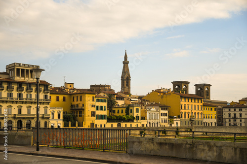 Fototapeta premium View of the historic centre of Florence, Unesco World Heritage Site, from Ponte alle Grazie bridge with Lungarno delle Grazie riverside and the bell tower of Basilica of Santa Croce, Tuscany, Italy