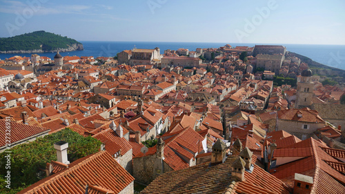 Fototapeta premium View of the historic city of Dubrovnik. View from the city walls to the medieval old town, buildings dating from the Middle Ages located by the sea. A frequent place of turistic tours.
