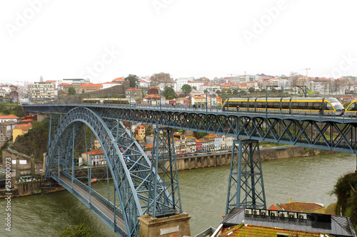 © zigres, Obraz premium View of the historic city of Porto, Portugal with the Dom Luiz bridge. Two metro train can be seen on the bridge.