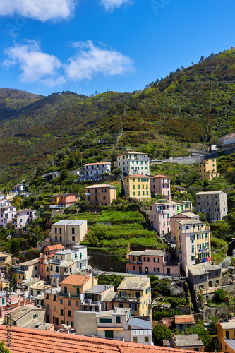 Obraz premium View of the houses in the Riomaggiore town. One of five famous centuries-old colorful villages of Cinque Terre National Park in Liguria, region of Italy.