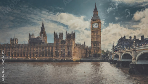 Fototapeta premium View of the Houses of Parliament and Big Ben along the River Thames in London under a cloudy sky during late afternoon