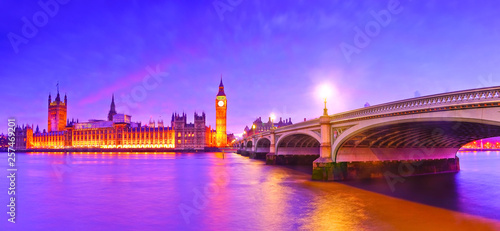 © Javen, Naklejka premium View of the Houses of Parliament and Westminster Bridge along River Thames in London at night.