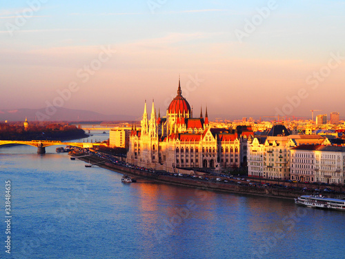 Obraz premium View of the Hungarian Parliament Building and the Danube river at sunset in...