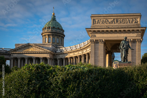 Fototapeta premium View of the Kazan Cathedral (Cathedral of the Kazan Icon of the Mother of God) on Nevsky Prospekt and the monument to Barclay de Tolly in the morning sun, St. Petersburg, Russia