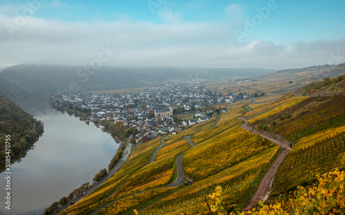 Fototapeta premium view of the Kroever vineyards in autumn season Germany Moselle River Valley