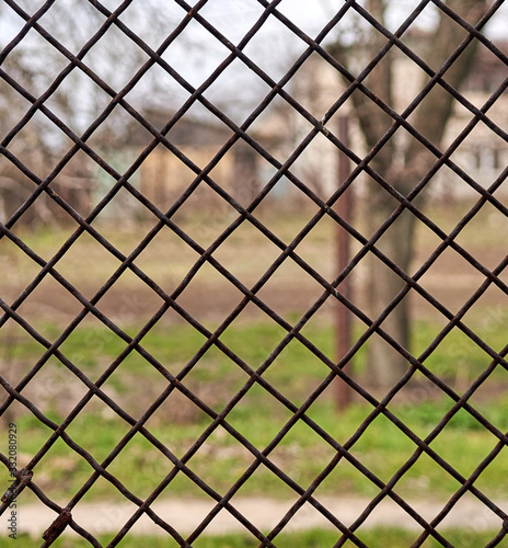 Fototapeta premium view of the landscape through an iron mesh