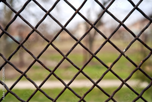 Fototapeta premium view of the landscape through an iron mesh