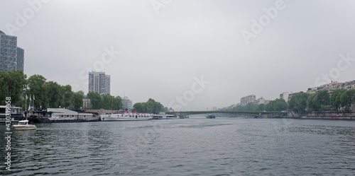 Naklejka premium View of the Mirabeau Bridge. On the river Seine ships sail, some moored in...