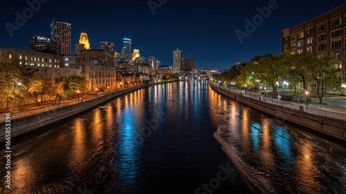 © Johannes, Naklejka premium view of the mississippi river from the stone arch bridge at night in minneapolis minnesota no logos no brands ar 169