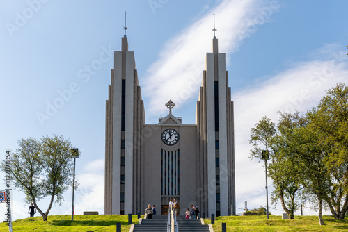 © makasana photo, Fototapeta premium view of the modern Luthern Church in downtown Akureyri in North Iceland