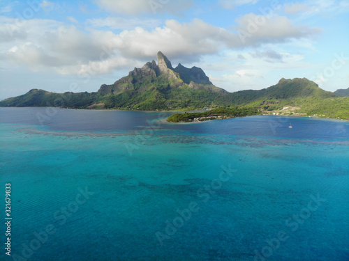 © eqroy, Obraz premium View of the Mont Otemanu mountain reflecting in water in Bora Bora, French Polynesia, South Pacific