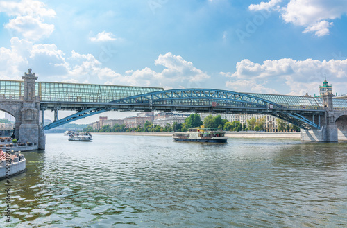 Naklejka premium View of the Moscow river embakment, Pushkinsky bridge and cruise ships at...
