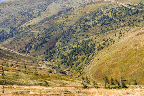 Naklejka premium view of the mountain couloir from the top of the ridge, mountain valley