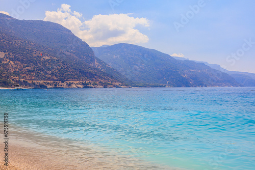 Fototapeta premium View of the mountains and the sea from Oludeniz beach, the blue lagoon. The cleanest beach with blue flag. Background