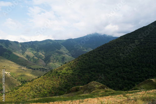 Fototapeta premium View of the mountains of the North Caucasus. Mountains in the clouds in summer
