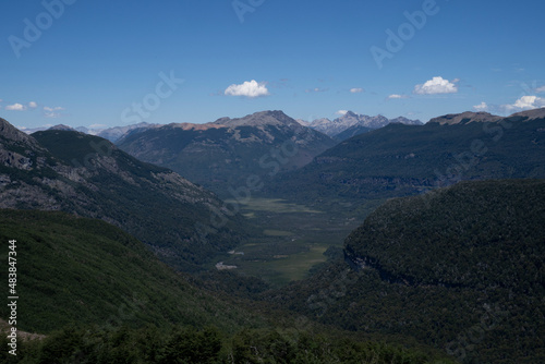 © Gonzalo, Obraz premium View of the mountains, valley and green forest, under a clear blue sky.