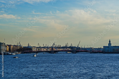 Fototapeta premium View of the Neva river, Palace bridge and port cranes of St. Petersburg.