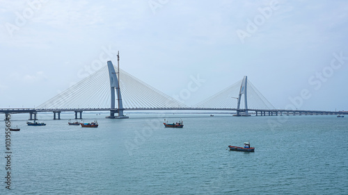 Fototapeta premium View of the newly built Sudarshan Setu, a cable-stayed bridge connecting Bet Dwarka Island to Okha, Okha, Devbhoomi Dwarka, Gujarat, India.