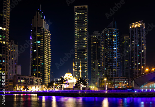 © Stavros, Fototapeta premium View of the night skyscrapers. High hotels on the seaside.