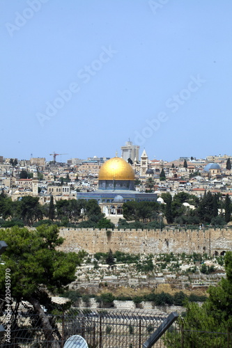 © Elroi, Obraz premium view of the old city of Jerusalem in Israel with an olive mountain. the golden dome of the Moslem mosque