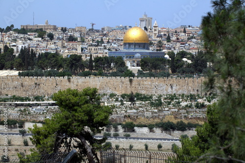 © Elroi, Obraz premium view of the old city of Jerusalem in Israel with an olive mountain. the golden dome of the Moslem mosque