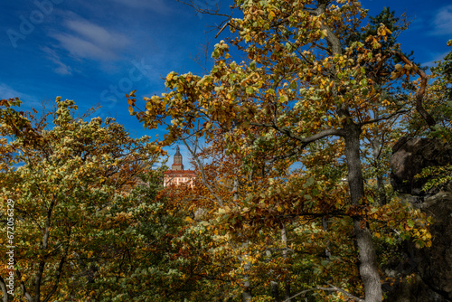 Fototapeta premium View of the old historic Książ Castle - autumn castle - panorama with a view of the Książ Castle