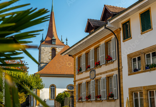 Fototapeta premium View of the old town of Murten and the German Church, Switzerland.