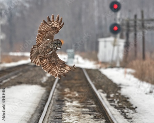 Fototapeta premium View of the owl flying over the snowy railroads