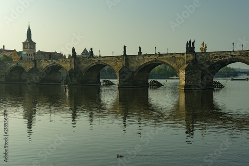 Fototapeta premium View of the panorama of the old historic center of Prague by the river and the Charles Bridge in the early morning