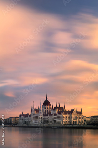 Obraz premium View of the parliament on the Danube river with romantic clouds during sunrise