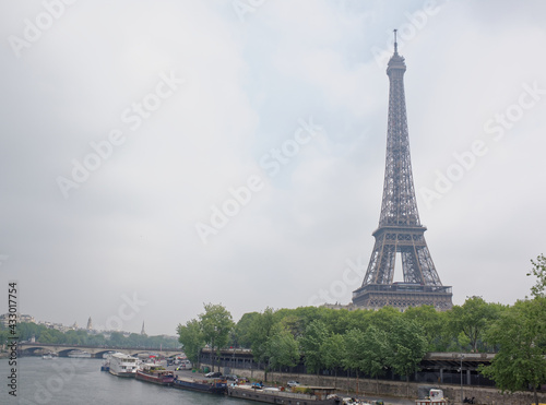 © Aleksandr, Fototapeta premium View of the Port de Suffren and the Eiffel Tower. In the port there are ships and cars