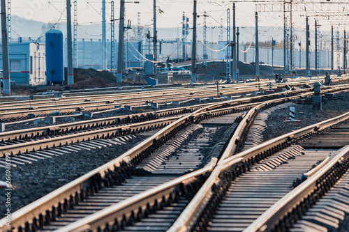 © Svyatoslav Balan, Fototapeta premium View of the rails, concrete sleepers and mound of crushed stone. The railroad tracks.