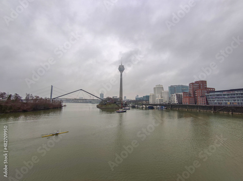 Naklejka premium View of the Rhein river at a grey winter in Dusseldorf with the Rheinturm television tv tower and bridge,Germany, Europe.
