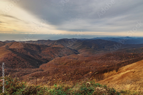 © Vit-Vit, Fototapeta premium View of the ridge of mountain peaks from a height of 1000 m. A mountain range with high peaks. Mountain peaks of the Caucasus on a sunny day. View of the peak of Mount Peus at an altitude of 1000 m.