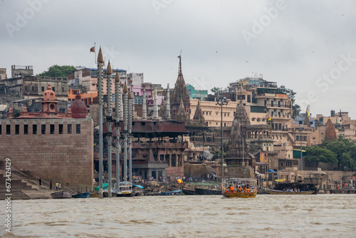 © angel, Fototapeta premium View of the river Ganges with its boats, people and sacred water of Varanasi in India. Manikarnika Ghat