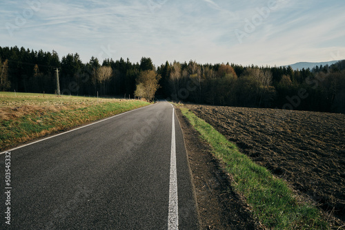 © Martin, Fototapeta premium view of the road leading into the dark forest in the morning sunlight
