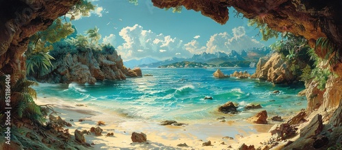© MBRAMO, Naklejka premium view of the sand beach from the cave, at sunrise