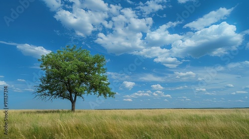 © Arif, Obraz premium view of the savanna with a shady tree under a clear, cloudy sky.