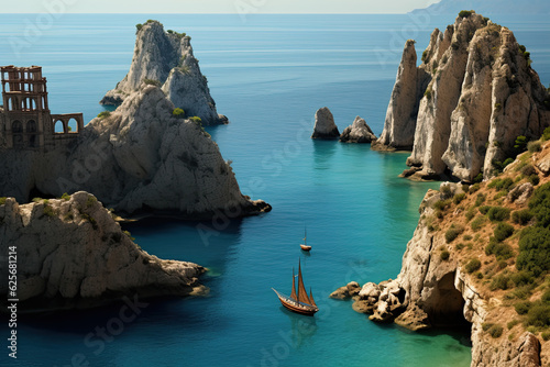 Fototapeta premium view of the sea with boat, ruins and rocks.