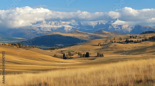 © BWS Stock, Fototapeta premium View of the Seiser Alm (Alpe di Siusi in Italian), one of the biggest alpine meadows on the Dolomites, with the Sassolungo and Sassopiatto peaks on the background